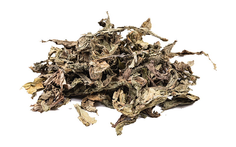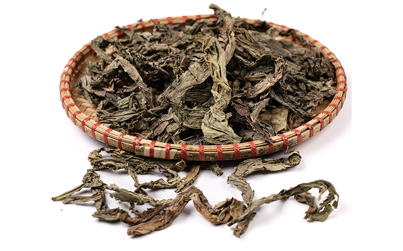 Lá mỏng nhăn nheo, nhiều hình dạng, thường có lá hình mũi mác, gần như không có cuống, mặt trên màu nâu sẫm, mặt dưới màu nâu nhạt, mép lá khứa răng cưa, to nhỏ không đều. Vị hơi đắng. Đoạn thân dài 3 cm đến 5 cm, tròn, thẳng, lõi xốp, mặt ngoài màu nâu nhạt, lốm đốm, có mấu mang lá hoặc vết tích của cuống lá.