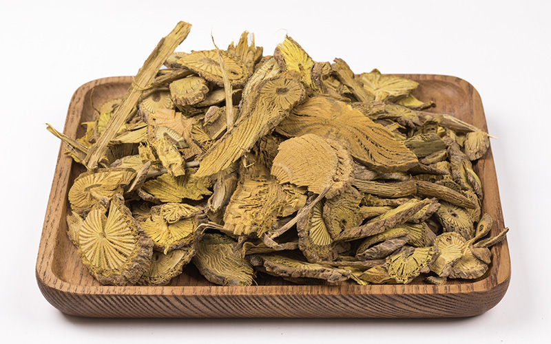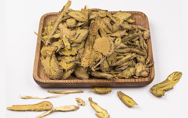 Dược liệu thường ở dạng đoạn thân hoặc rễ hình trụ. Mặt ngoài: màu vàng nâu hoặc vàng xám, có vết nhăn dọc hoặc sẹo rễ. Mặt cắt màu vàng tươi đến vàng cam, đôi khi có vòng đồng tâm hoặc vân tia tỏa ra từ tâm, rất đặc trưng. Thể chất cứng, giòn, dễ gãy, bột màu vàng tươi. Mùi nhẹ, vị đắng rõ.